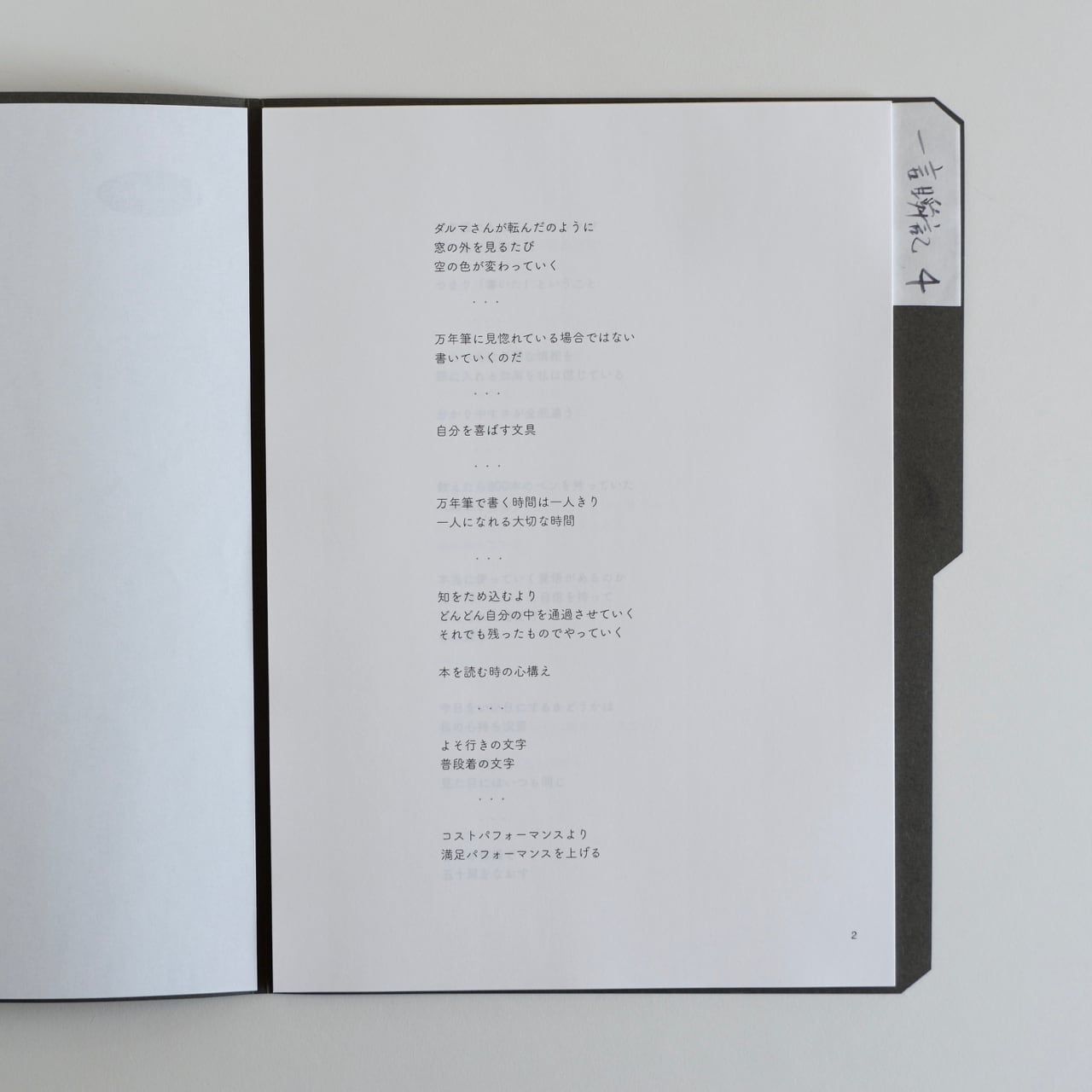 A4フォルダー Paper DockにA4の紙を挟み込んだフォルダー式のZINE(冊子)となります。最後のページには万年筆で手書きしています。