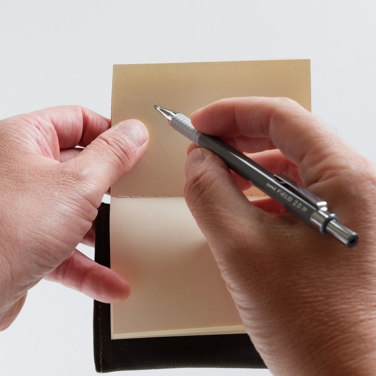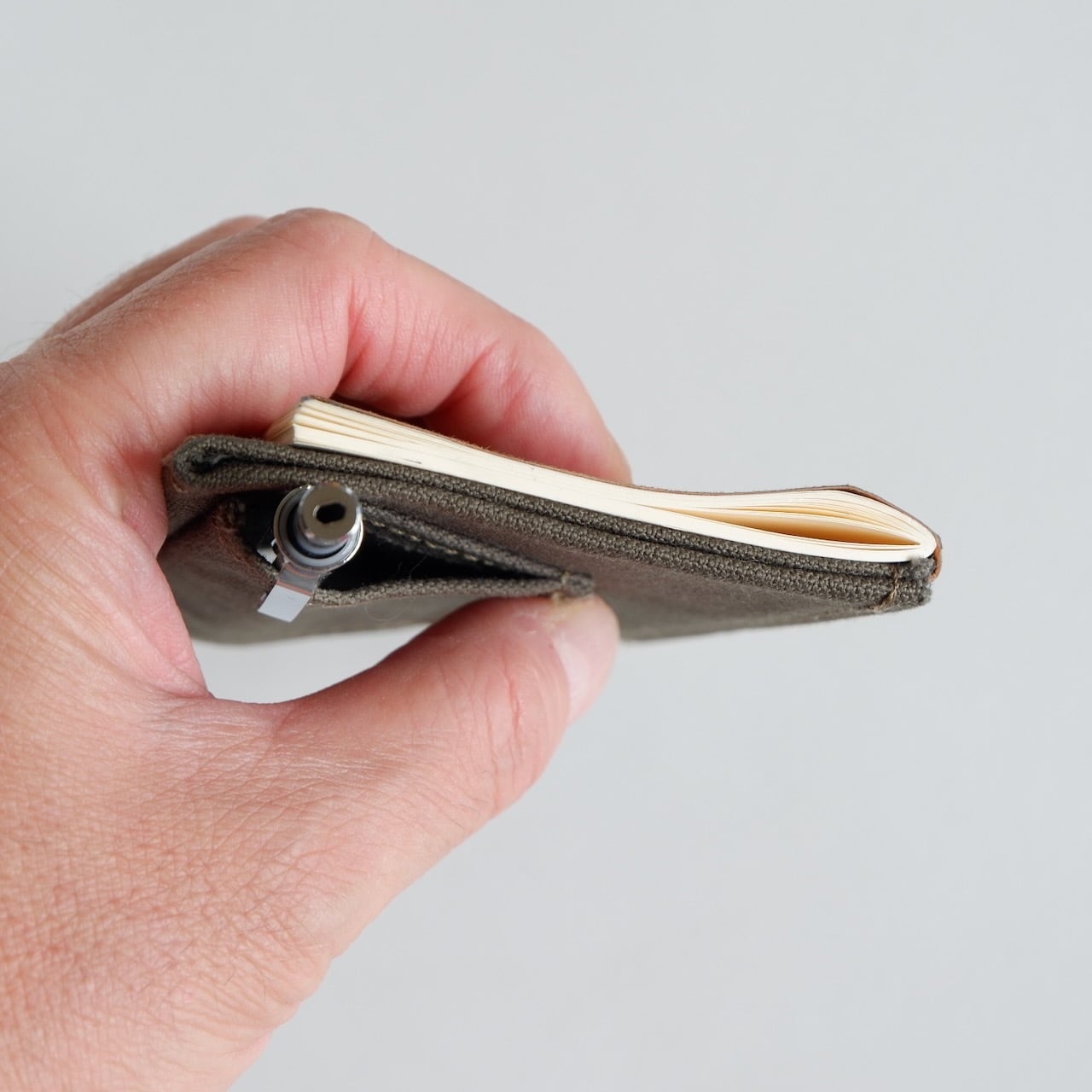 小さなA7サイズのノートやメモとペンをセットして携帯できるアイテムです。
