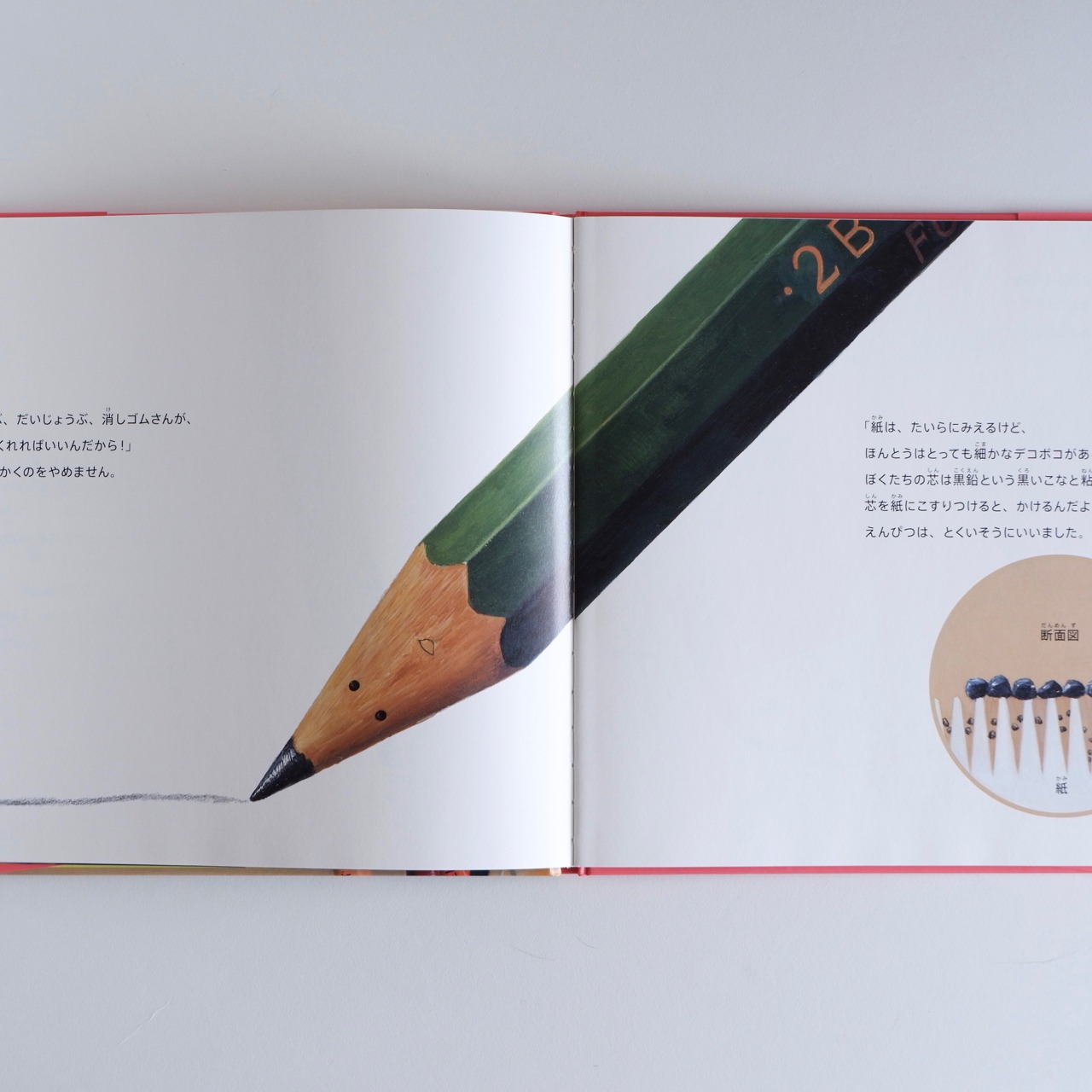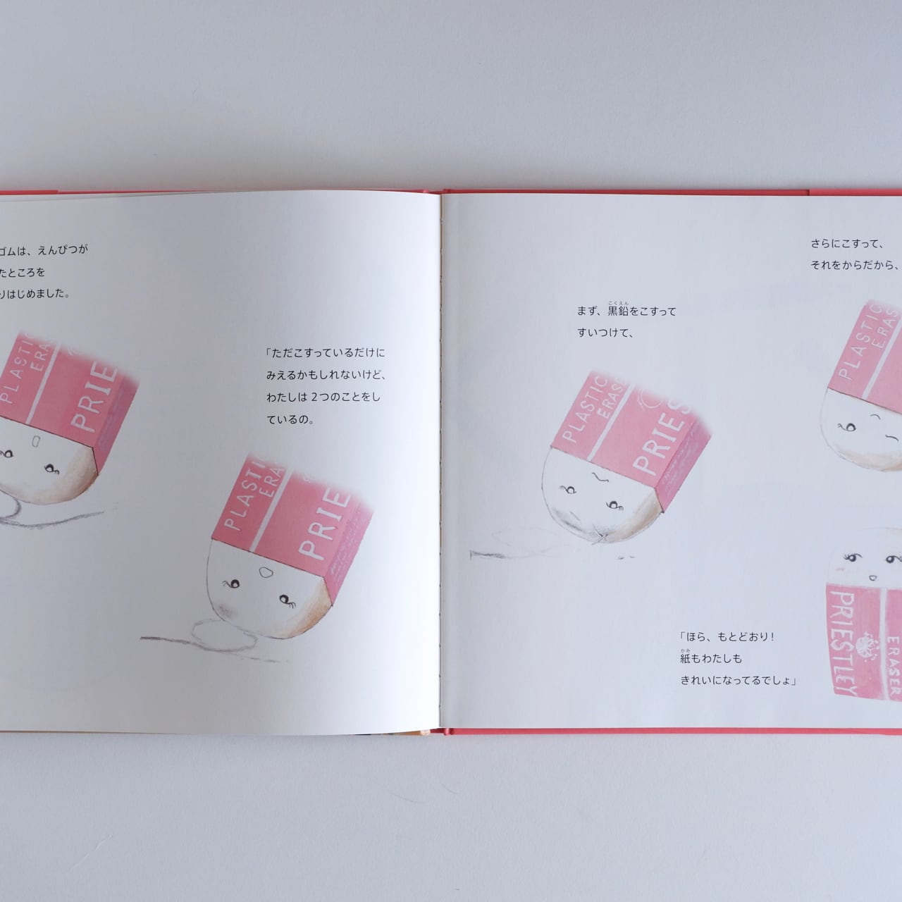 絵は洋画家の小池壮太さん、とてもリアルに描かれています。鉛筆の木目のザラザラとした質感や消しゴムのマットな感じが見事に表現されています。そのリアルな文具たちに目や口があって、そのギャップがまた楽しいです。そこも見どころです。